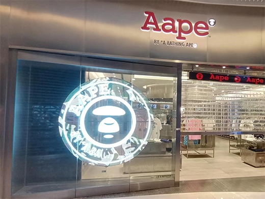 Aape是香港I.T集團的知名日系街頭潮牌,智彩科技為廣州天環廣場Aape門店量身定制透明led顯示屏。